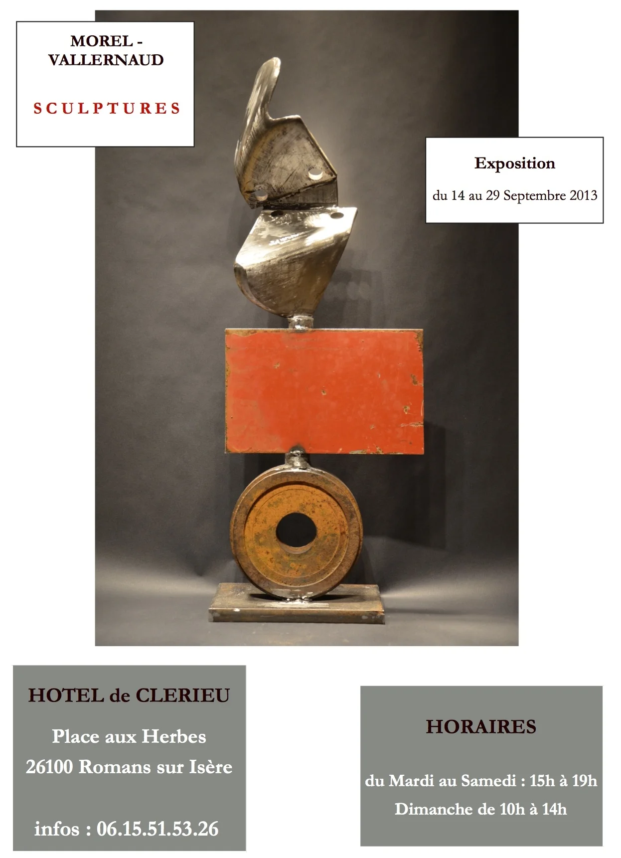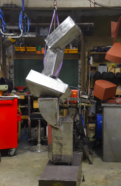 L’idée initiale fut de créer des formes abstraites à partir de pièces de récupération. Vint alors assez rapidement l’envie de créer des volumes plus « architecturés » en découpant et soudant de la tôle d’acier. Parallèlement, le thème de la chute, du déséquilibre à la limite de la rupture, s’est imposé comme axe central, actuellement en cours de déclinaison. Bien que géométriques, ces sculptures ne sont en rien mécaniques, montrant délibérément qu’elles sont incarnées. Contre l’inéluctable force de la gravitation, l’homme est en lutte permanente pour conserver son équilibre.